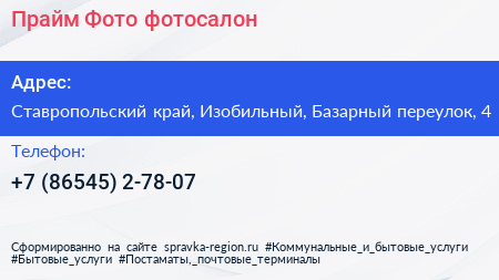 Прайм-Фото, фотосалон по адресу Ставропольский край, Изобильный, Базарный переулок, 4 в дальнейшем Организация, размещена в следующих категориях: