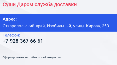 Суши Даром, служба доставки по адресу Ставропольский край, Изобильный, улица Кирова, 253 в дальнейшем Организация, размещена в следующих категориях: