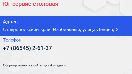 Юг-сервис, столовая по адресу Ставропольский край, Изобильный, улица Ленина, 2 в дальнейшем Организация, размещена в следующих категориях: