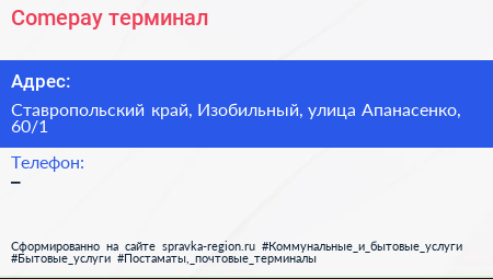 Comepay, терминал по адресу Ставропольский край, Изобильный, улица Апанасенко, 60/1 в дальнейшем Организация, размещена в следующих категориях: