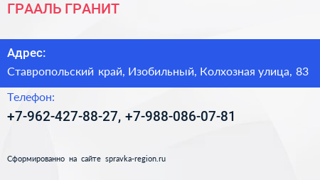 ГРААЛЬ-ГРАНИТ по адресу Ставропольский край, Изобильный, Колхозная улица, 83 в дальнейшем Организация, размещена в следующих категориях:
