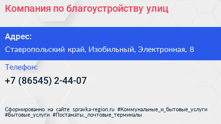 Компания по благоустройству улиц по адресу Ставропольский край, Изобильный, Электронная, 8 в дальнейшем Организация, размещена в следующих категориях: