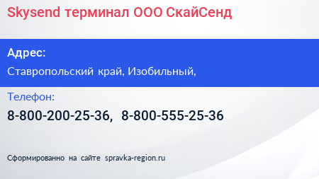 Skysend, терминал, ООО СкайСенд по адресу Ставропольский край, Изобильный, в дальнейшем Организация, размещена в следующих категориях: