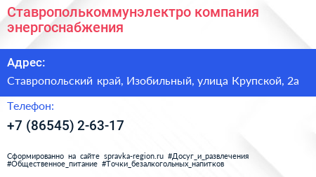 Ставрополькоммунэлектро, компания энергоснабжения по адресу Ставропольский край, Изобильный, улица Крупской, 2а в дальнейшем Организация, размещена в следующих категориях: