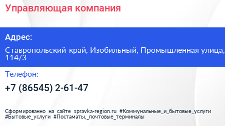 Управляющая компания по адресу Ставропольский край, Изобильный, Промышленная улица, 114/3 в дальнейшем Организация, размещена в следующих категориях: