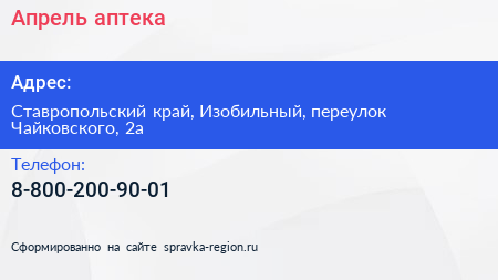 Апрель, аптека по адресу Ставропольский край, Изобильный, переулок Чайковского, 2а в дальнейшем Организация, размещена в следующих категориях: