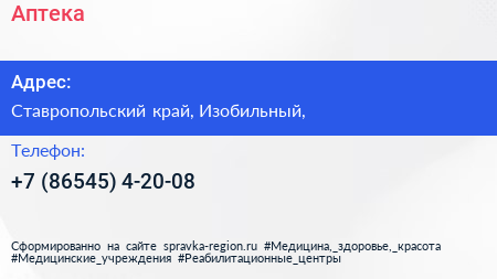 Аптека по адресу Ставропольский край, Изобильный, в дальнейшем Организация, размещена в следующих категориях: