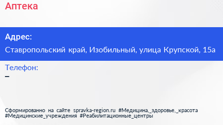 Аптека по адресу Ставропольский край, Изобильный, улица Крупской, 15а в дальнейшем Организация, размещена в следующих категориях: