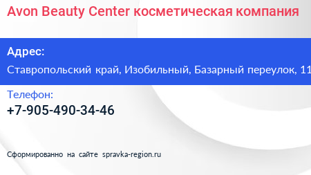 Avon Beauty Center, косметическая компания по адресу Ставропольский край, Изобильный, Базарный переулок, 11 в дальнейшем Организация, размещена в следующих категориях:
