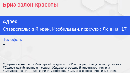 Бриз, салон красоты по адресу Ставропольский край, Изобильный, переулок Ленина, 17 в дальнейшем Организация, размещена в следующих категориях: