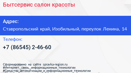 Бытсервис, салон красоты по адресу Ставропольский край, Изобильный, переулок Ленина, 14 в дальнейшем Организация, размещена в следующих категориях: