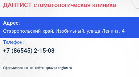 ДАНТИСТ, стоматологическая клиника по адресу Ставропольский край, Изобильный, улица Ленина, 4 в дальнейшем Организация, размещена в следующих категориях: