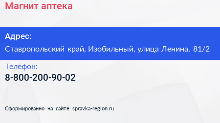 Магнит, аптека по адресу Ставропольский край, Изобильный, улица Ленина, 81/2 в дальнейшем Организация, размещена в следующих категориях: