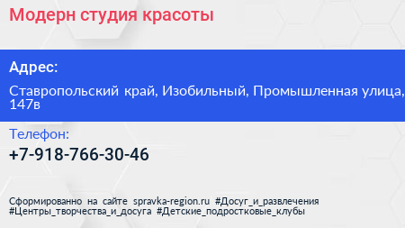 Модерн, студия красоты по адресу Ставропольский край, Изобильный, Промышленная улица, 147в в дальнейшем Организация, размещена в следующих категориях: