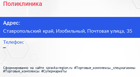 Поликлиника по адресу Ставропольский край, Изобильный, Почтовая улица, 35 в дальнейшем Организация, размещена в следующих категориях: