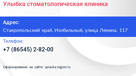 Улыбка, стоматологическая клиника по адресу Ставропольский край, Изобильный, улица Ленина, 117 в дальнейшем Организация, размещена в следующих категориях: