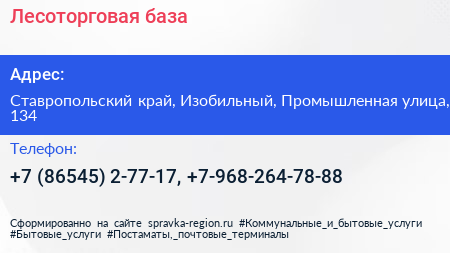 Лесоторговая база по адресу Ставропольский край, Изобильный, Промышленная улица, 134 в дальнейшем Организация, размещена в следующих категориях: