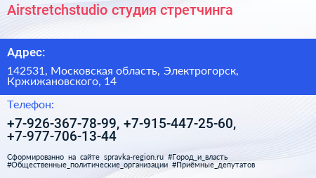 Airstretchstudio, студия стретчинга по адресу 142531, Московская область, Электрогорск, Кржижановского, 14 в дальнейшем Организация, размещена в следующих категориях: