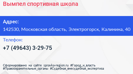 Вымпел, спортивная школа по адресу 142530, Московская область, Электрогорск, Калинина, 40 в дальнейшем Организация, размещена в следующих категориях: