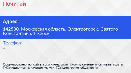 Почитай по адресу 142530, Московская область, Электрогорск, Святого Константина, 1 киоск в дальнейшем Организация, размещена в следующих категориях: