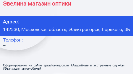 Эвелина, магазин оптики по адресу 142530, Московская область, Электрогорск, Горького, 3Б в дальнейшем Организация, размещена в следующих категориях: