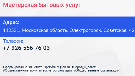 Мастерская бытовых услуг по адресу 142531, Московская область, Электрогорск, Советская, 42 в дальнейшем Организация, размещена в следующих категориях: