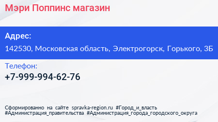 Мэри Поппинс, магазин по адресу 142530, Московская область, Электрогорск, Горького, 3Б в дальнейшем Организация, размещена в следующих категориях: