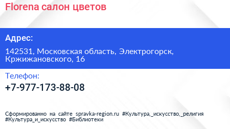Florena, салон цветов по адресу 142531, Московская область, Электрогорск, Кржижановского, 16 в дальнейшем Организация, размещена в следующих категориях: