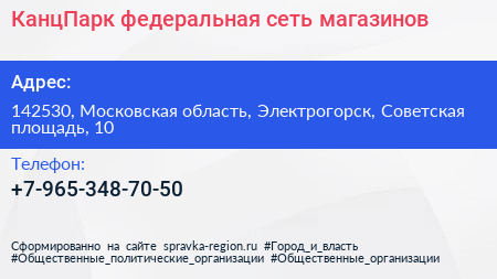 КанцПарк, федеральная сеть магазинов по адресу 142530, Московская область, Электрогорск, Советская площадь, 10 в дальнейшем Организация, размещена в следующих категориях: