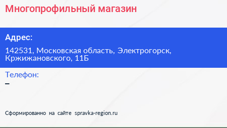 Многопрофильный магазин по адресу 142531, Московская область, Электрогорск, Кржижановского, 11Б в дальнейшем Организация, размещена в следующих категориях: