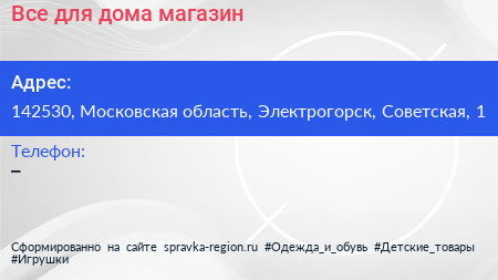 Все для дома, магазин по адресу 142530, Московская область, Электрогорск, Советская, 1 в дальнейшем Организация, размещена в следующих категориях:
