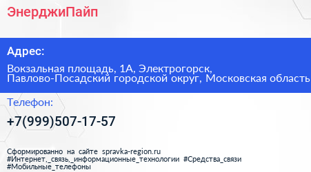 ЭнерджиПайп по адресу Вокзальная площадь, 1А, Электрогорск, Павлово-Посадский городской округ, Московская область в дальнейшем Организация, размещена в следующих категориях: