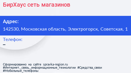 БирХаус, сеть магазинов по адресу 142530, Московская область, Электрогорск, Советская, 1 в дальнейшем Организация, размещена в следующих категориях: