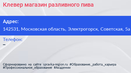 Клевер, магазин разливного пива по адресу 142531, Московская область, Электрогорск, Советская, 5а в дальнейшем Организация, размещена в следующих категориях: