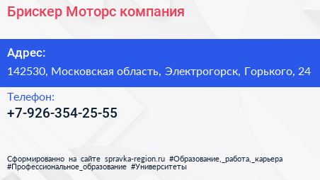 Брискер-Моторс, компания по адресу 142530, Московская область, Электрогорск, Горького, 24 в дальнейшем Организация, размещена в следующих категориях: