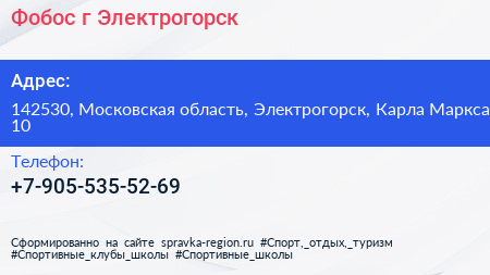 Фобос, г. Электрогорск по адресу 142530, Московская область, Электрогорск, Карла Маркса, 10 в дальнейшем Организация, размещена в следующих категориях: