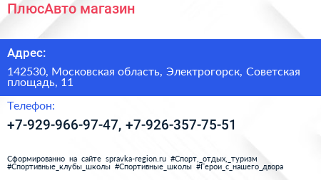 ПлюсАвто, магазин по адресу 142530, Московская область, Электрогорск, Советская площадь, 11 в дальнейшем Организация, размещена в следующих категориях:
