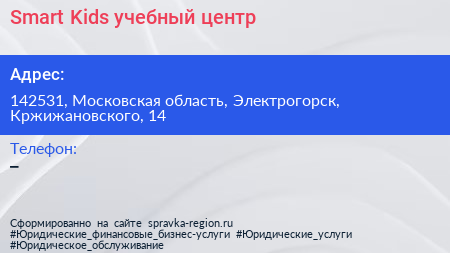 Smart Kids, учебный центр по адресу 142531, Московская область, Электрогорск, Кржижановского, 14 в дальнейшем Организация, размещена в следующих категориях: