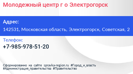Молодежный центр г.о. Электрогорск по адресу 142531, Московская область, Электрогорск, Советская, 2 в дальнейшем Организация, размещена в следующих категориях: