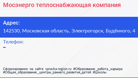 Мосэнерго, теплоснабжающая компания по адресу 142530, Московская область, Электрогорск, Будённого, 4 в дальнейшем Организация, размещена в следующих категориях: