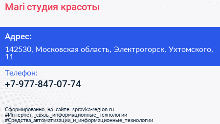 Mari, студия красоты по адресу 142530, Московская область, Электрогорск, Ухтомского, 11 в дальнейшем Организация, размещена в следующих категориях:
