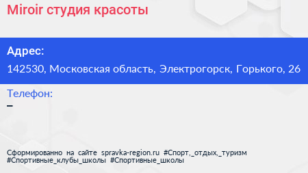 Miroir, студия красоты по адресу 142530, Московская область, Электрогорск, Горького, 26 в дальнейшем Организация, размещена в следующих категориях: