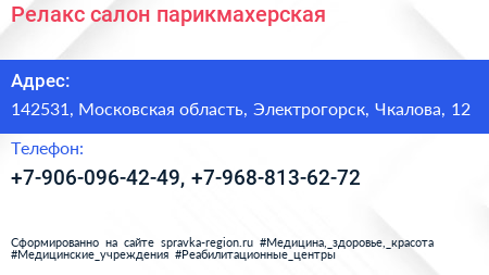 Релакс, салон-парикмахерская по адресу 142531, Московская область, Электрогорск, Чкалова, 12 в дальнейшем Организация, размещена в следующих категориях: