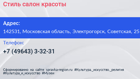 Стиль, салон красоты по адресу 142531, Московская область, Электрогорск, Советская, 25 в дальнейшем Организация, размещена в следующих категориях: