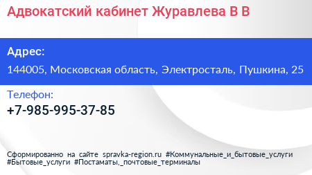 Адвокатский кабинет Журавлева В.В. по адресу 144005, Московская область, Электросталь, Пушкина, 25 в дальнейшем Организация, размещена в следующих категориях: