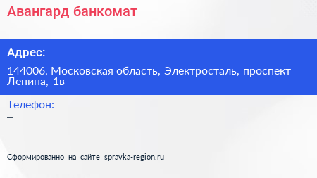 Авангард, банкомат по адресу 144006, Московская область, Электросталь, проспект Ленина, 1в в дальнейшем Организация, размещена в следующих категориях: