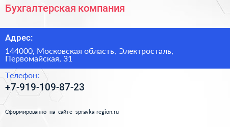 Бухгалтерская компания по адресу 144000, Московская область, Электросталь, Первомайская, 31 в дальнейшем Организация, размещена в следующих категориях: