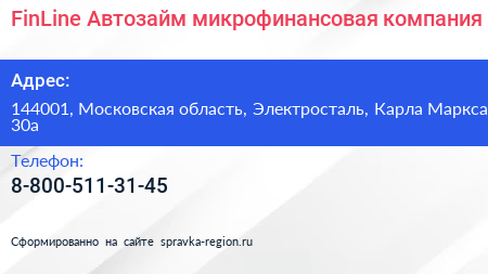 FinLine-Автозайм, микрофинансовая компания по адресу 144001, Московская область, Электросталь, Карла Маркса, 30а в дальнейшем Организация, размещена в следующих категориях: