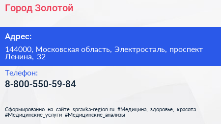 Город Золотой по адресу 144000, Московская область, Электросталь, проспект Ленина, 32 в дальнейшем Организация, размещена в следующих категориях: