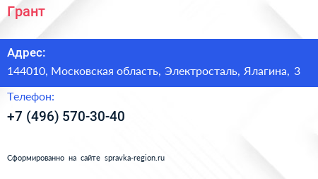 Грант по адресу 144010, Московская область, Электросталь, Ялагина, 3 в дальнейшем Организация, размещена в следующих категориях: